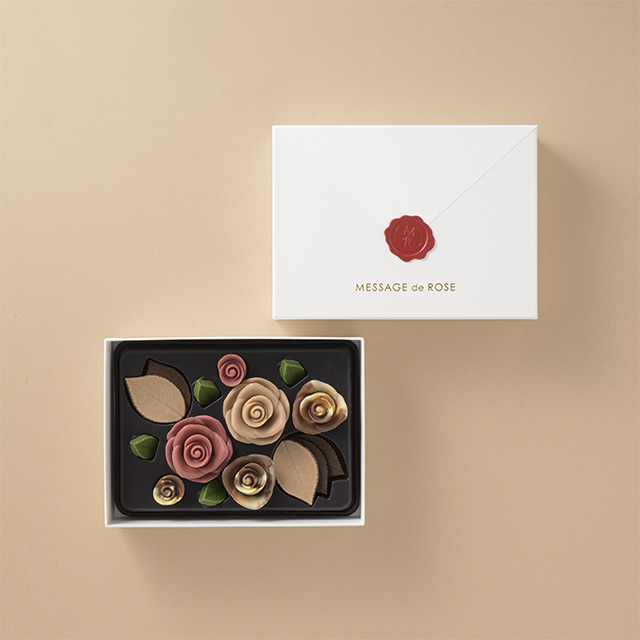 ミルクマーブル、イチゴ、ビター、ミルク、抹茶の薔薇やリーフを詰めました。